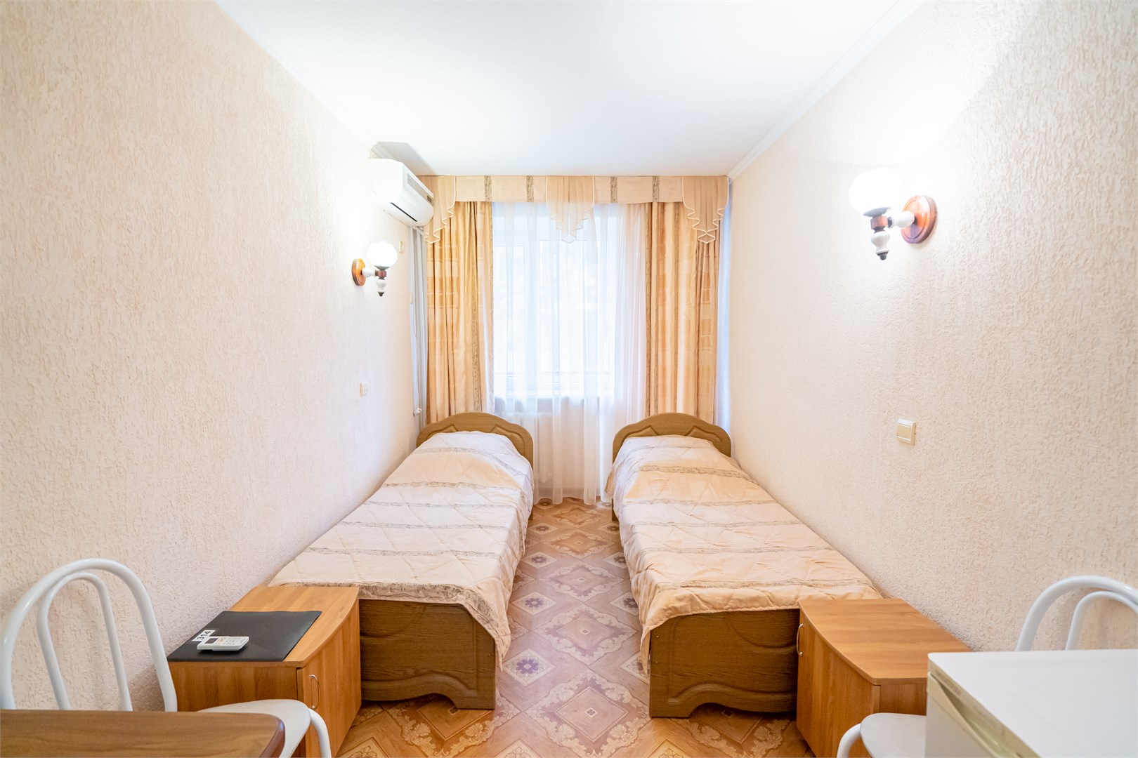 1-комнатный 2-местный улучшенный (с доп. местом и без доп. места)- площадь 13,3 кв.м. В каждом номере имеется: лоджия, с которой открывается красивый вид на парк, сплит-система, телевизор, холодильник, душ, туалет, раковина, мебель (прихожая, встроенный шкаф для одежды, тумбочки, стол, стулья, раздельные кровати/двуспальная кровать), зеркало.