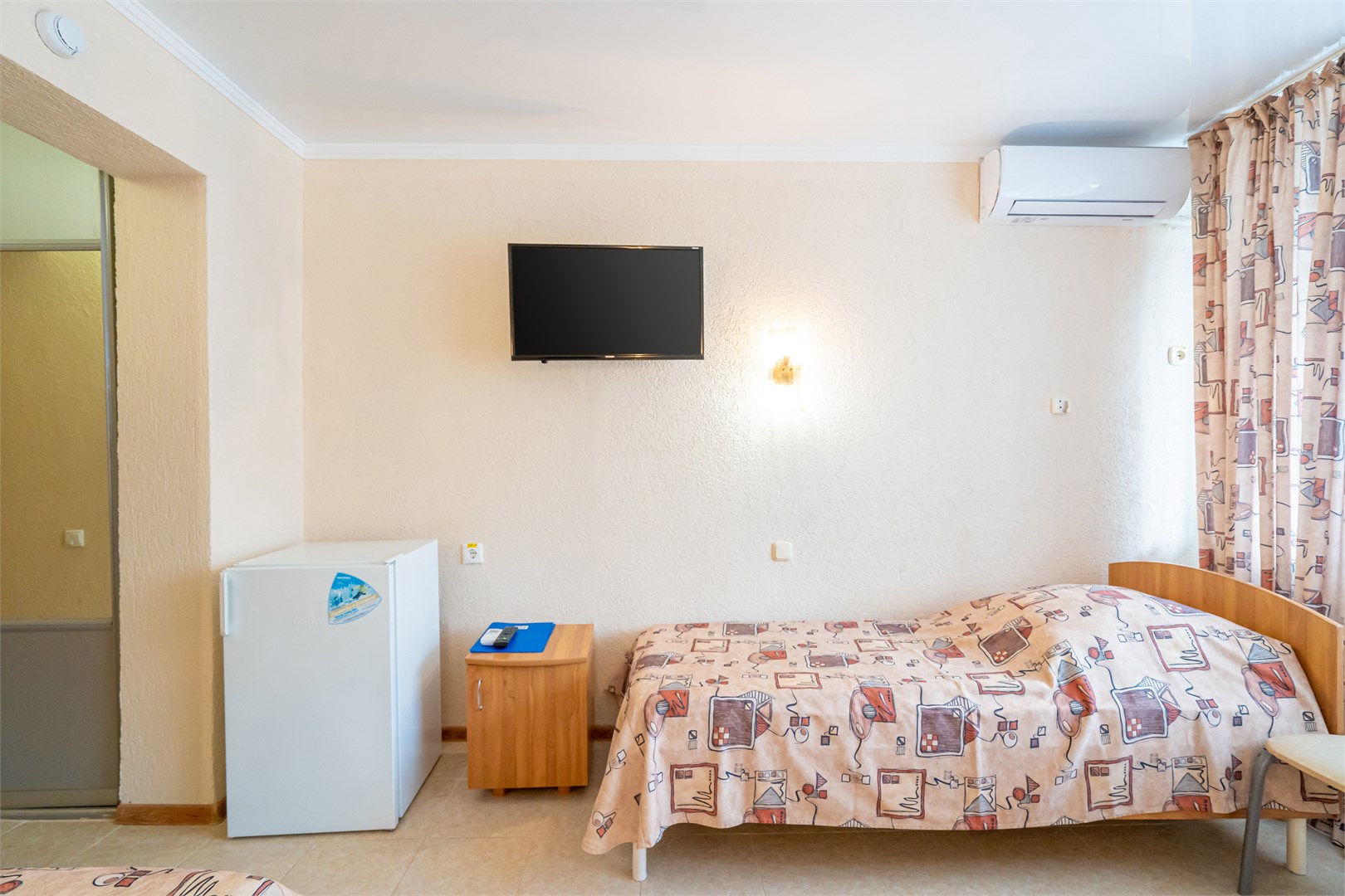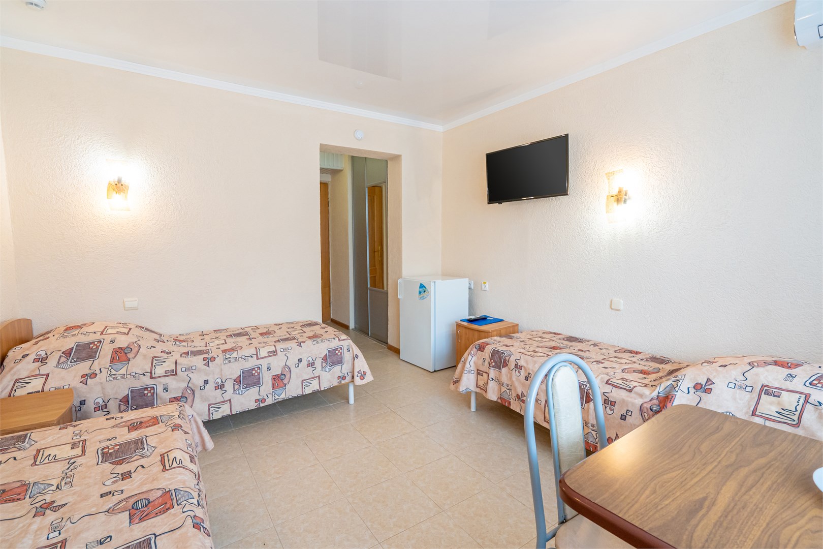 2-комнатный 5-местный (без доп. места)- площадь 23 кв.м. В каждом номере: две комнаты, 5 односпальных кроватей, дополнительное место (диван) и душевая комната, телевизор, холодильник, сплит-система, балкон.